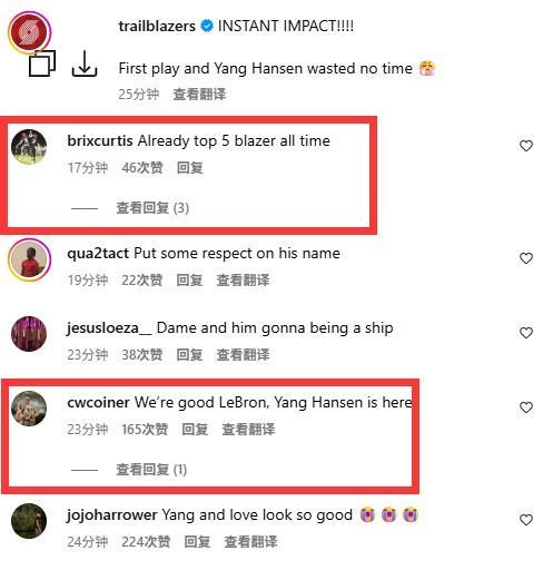 开拓者队官方账号发文:“立竿见影的影响!!!首次登场,杨瀚森没有浪费任何时间。”